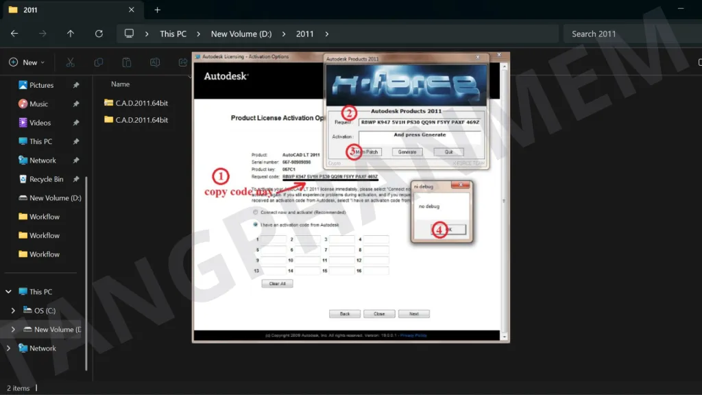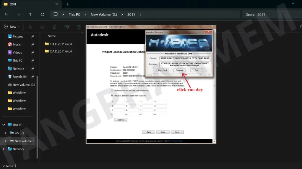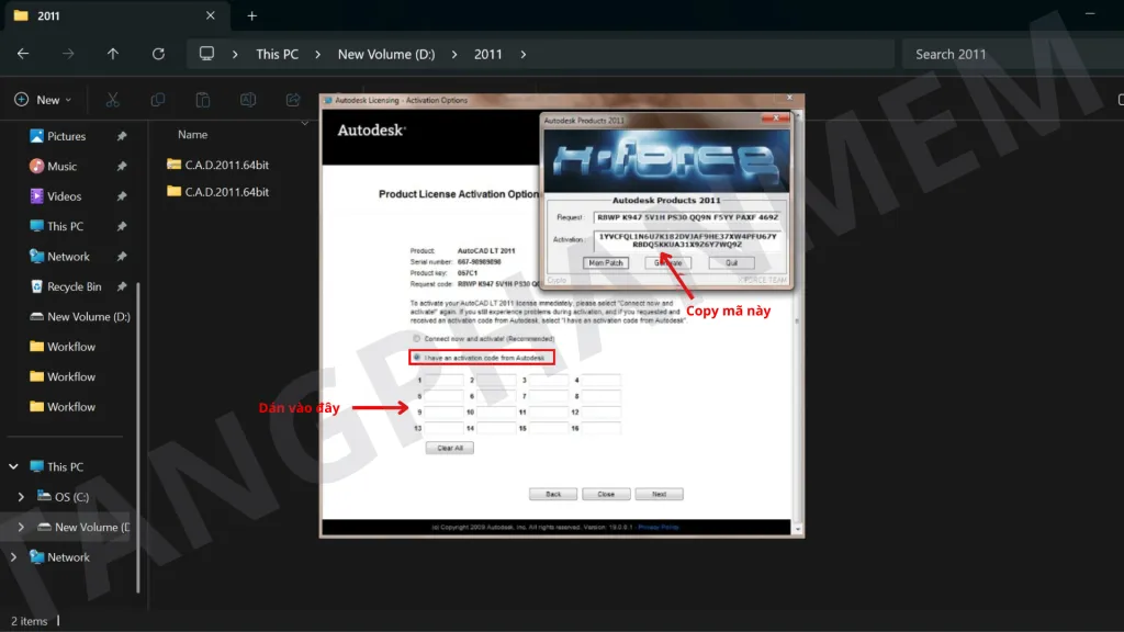 Bây giờ, bạn hãy sao chép mã Activation vừa được tạo và dán vào ô tương ứng trong cửa sổ kích hoạt của Autocad 2011.