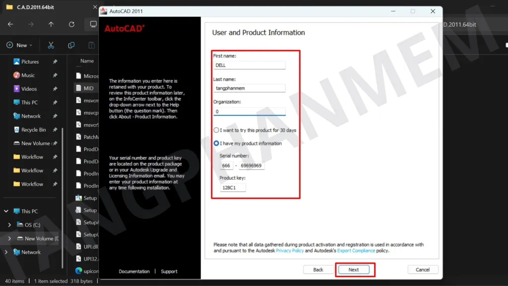 Tại bước này, bạn cần điền các thông tin cần thiết. Nhập “Serial Number: 666-69696969” và “Product Key: 128C1”, sau đó nhấn “Next”. Đây là những thông tin quan trọng để phần mềm có thể được cài đặt.
