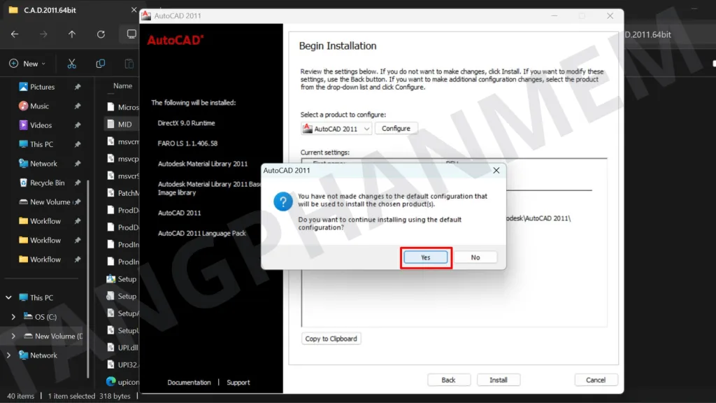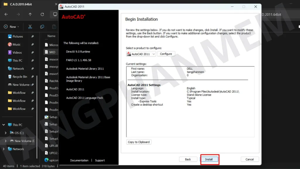 Sau khi hoàn tất các bước trên, bạn nhấn nút “Install” để bắt đầu quá trình Cài đặt Autocad 2011. Hệ thống có thể hỏi xác nhận, hãy nhấn “Yes”.