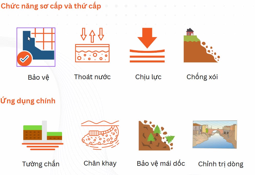 Được chứng nhận Hợp chuẩn, về tiêu chuẩn Quốc gia TCVN 10335:2014 về Rọ đá – Thảm đá và các sản phẩm mắt lưới xoắn kép. Phụ vụ xây dựng công trình giao thông đường thủy. Phù hợp cho các chức năng kè mềm, chống xói mòn kênh, lót kênh và các công trình chỉnh trị. Cũng như các chức năng thứ cấp khác như tường chắn đất có cốt. Tường chắn bảo vệ, tường chắn tiêu năng.
