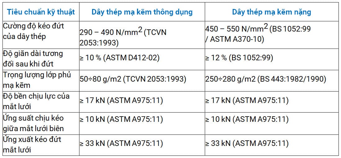Tiêu chuẩn về dây đan mạ kẽm. Hưng Phú sản xuất dựa trên 02 loại dây đan mạ kẽm nặng và dây đan mạ kẽm nhẹ.Tiêu chuẩn cơ sở là TCVN 2053 – 1993 (Tương đương 50 – 80gr/m2) và dây đan mạ kẽm nặng theo tiêu chuẩn TCVN 10335 – 2014 (Tương đương 250 – 280 gr/m2 – BS 443:1982/1990)