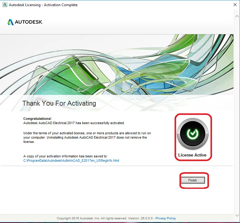 Khi hoàn tất, phần mềm sẽ hiển thị thông báo “License Active” xác nhận rằng quá trình kích hoạt đã thành công. Bấm “Finish” để kết thúc. Như vậy, bạn đã hoàn thành việc cài đặt và kích hoạt phần mềm AutoCAD Electrical 2017 và sẵn sàng để bắt đầu các dự án thiết kế điện chuyên nghiệp.