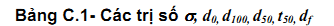 Bảng C.1- Các trị số σ, d0, d100, d50, t50, df