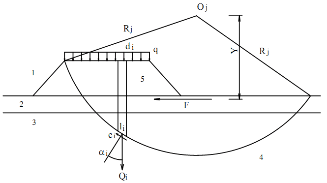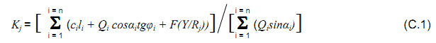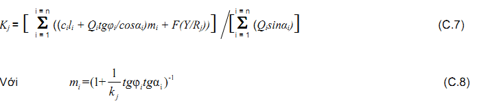 Tính toán theo phương pháp Bishop thì hệ số ổn định Kj ứng với một mặt trượt tròn trung tâm Oj (Hình C.1) được xác định theo công thức sau: